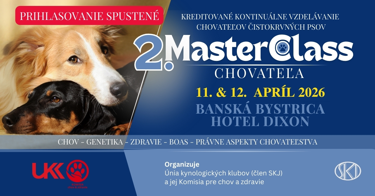 Máte jedinečnú príležitosť rozšíriť svoje vedomosti v oblasti chovateľstva .MasterClass chovateľa organizuje Únia kynologických klubov (člen SKJ) a jej Komisia pre chov a zdravie.